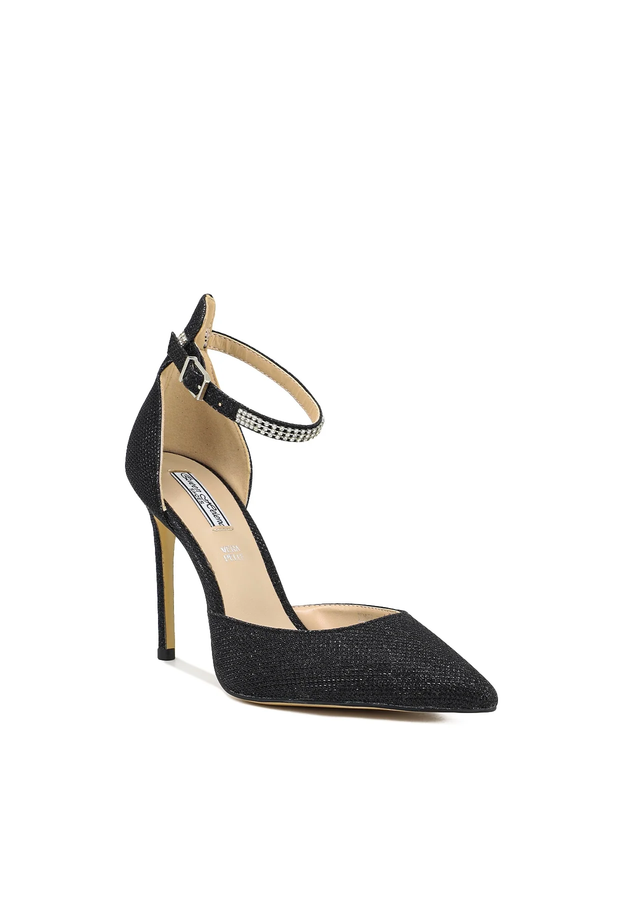 Scarpe donna con tacco alto 10 cm. Dècolletè con tomaia in tessuto lurex e strass sul cinturino. Sottopiede in vera pelle. Calzata regolare.